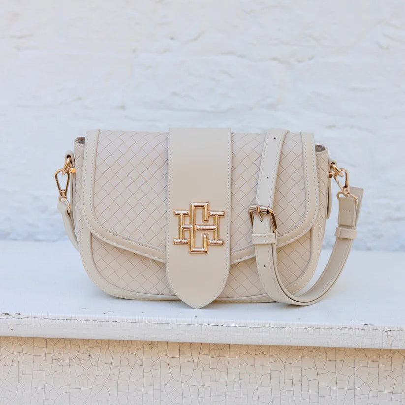 Elevate your everyday look with the Griffin Crossbody Bag in Woven Almond. Crafted from beautiful woven straw with classic diamond quilting and faux lambskin trim, this bag blends natural texture with a polished, timeless style. The shiny gold Caroline Hill logo adds a signature touch on the magnetic flap closure.